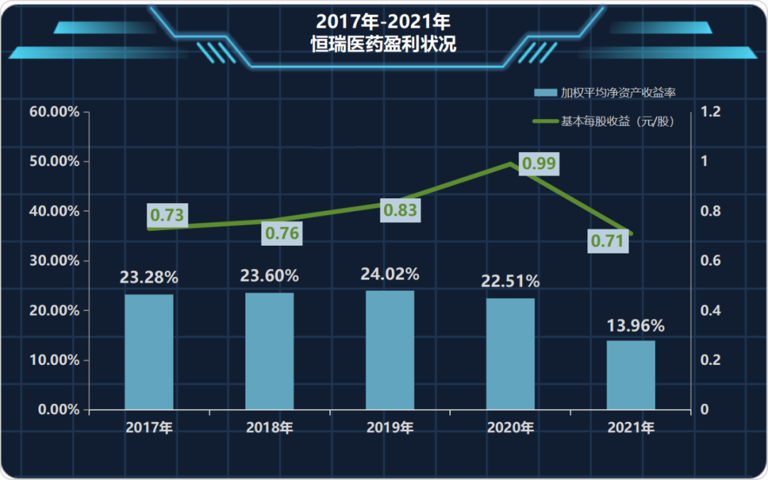以代表着企业净资产创造利润能力的加权平均净资产收益率(ROE)来看,近五年以来,恒瑞医药的ROE持续走低,尤其近两年,从23%左右降至不足14%。这意味着,恒瑞自身造血的能力正在变弱。