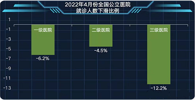 今年4月以来,上海等地爆发了较为严重的新冠疫情。据国家卫健委公布的数据,今年4月,全国公立医院接收患者2.5亿人次,同比下降10.7%;地方小医院受影响最为严重,由2021年4月的1599.2万人次降至今年4月的1391.5万人次,同比下降13%。一级医院、二级医院、三级医院的下降比例分别为6.2%、4.5%和12.2%。
