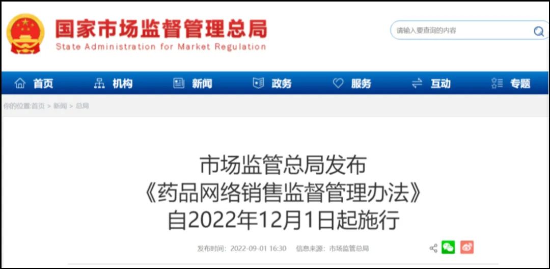9月1日,国家市场监督管理总局发布《药品网络销售监督管理办法》(国家市场监督管理总局令第58号),自2022年12月1日起施行。