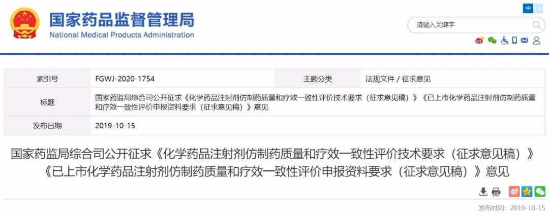 2019年10月15日,为推进化学药品注射剂仿制药质量和疗效一致性评价工作,国家药监局官网接连发布两份注射剂一致性评价相关文件,推动注射剂一致性评价提速,千亿注射剂市场迎来洗牌。