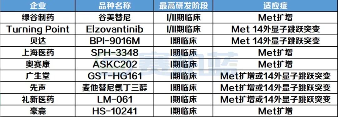 国内对于Met抑制剂的研发逐渐趋热,除了伯瑞替尼以及上文所提的已在国外上市的卡马替尼、特泊替尼之外,还有9个品种处于临床阶段。