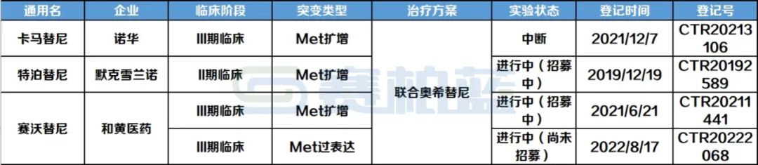 目前已上市的三款药物均已开展EGFR-TKI耐药后的Met扩增相关临床试验,治疗方案均选择与奥希替尼联合。