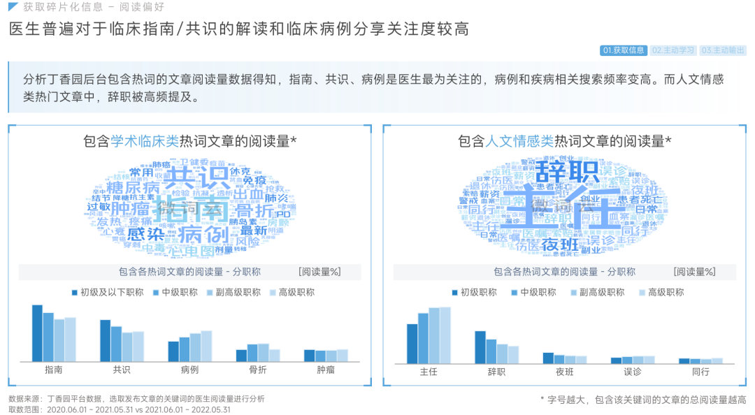 今年的 「Hi doctor 2022中国医生行为洞察报告」,我们从获取信息、主动学习与主动输出三个层面分别拆解了医生线上医学行为。
