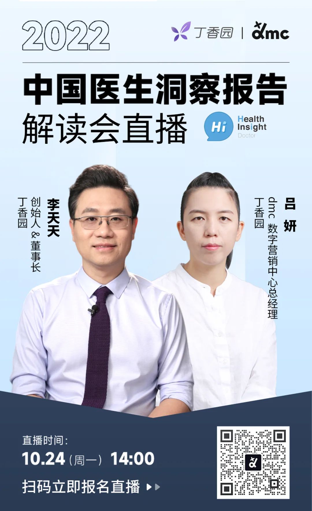 过去一年,对整个医疗行业来说是不平凡的一年,疫情的倒逼与政策加持下,互联网医疗正在逐步回归实质。借助互联网手段,医疗服务也正在加速数字化、移动化和智能化。今年的《2022 中国医生洞察报告》将如期与大家见面,在 10 月 24 日正式发布,届时将由丁香园创始人&董事长李天天,dmc 大麦茶数字营销总经理吕妍一同深度解读。