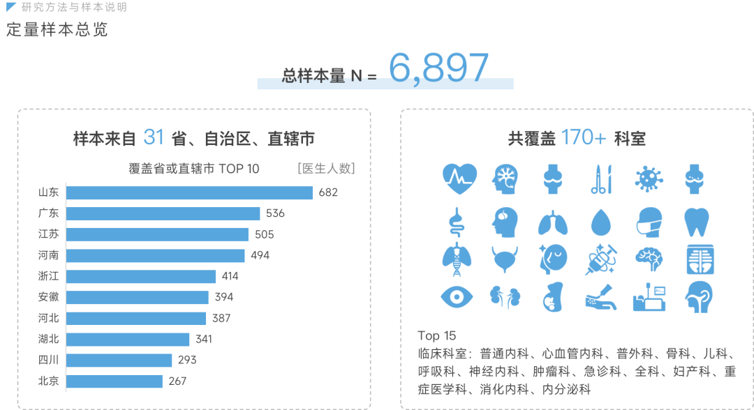我们从普通内科、心血管内科、普外科、骨科、儿科、呼吸科、神经内科、肿瘤科、急诊科等覆盖超过 170 个科室,采集了来自 31 个省、自治区、直辖市共计 6897 条数据。将市场类型分为核心与广阔两大市场,涵盖了高级、副高级、中级、初级等职称。在数据来源方面通过丁香园新媒体矩阵(包括微信公众号、论坛、医生社群等)发布问卷,进行数据收集。