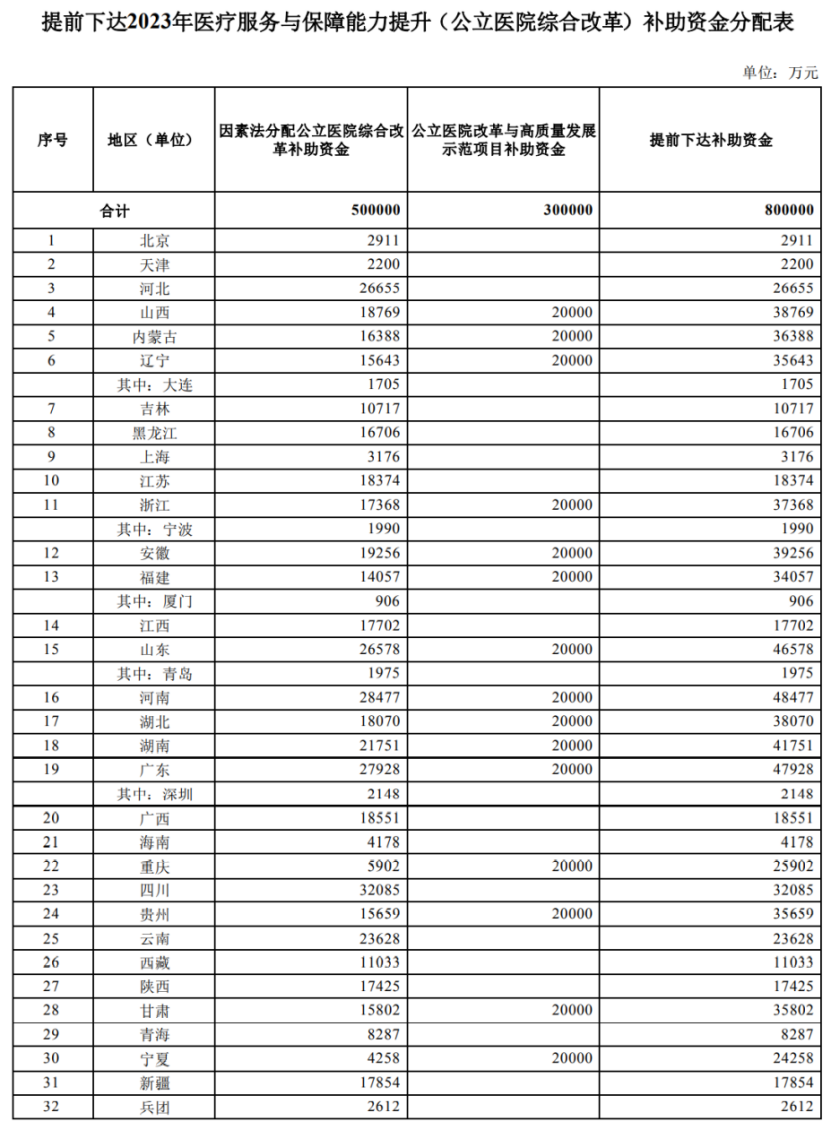 其中,提前下达2023年医疗服务与保障能力提升(公立医院综合改革)补助资金80亿元,用于推进公立医院综合改革,补助资金与去年基本持平。因素法分配公立医院综合改革补助资金50亿元,公立医院改革与高质量发展示范项目补助资金30亿元。