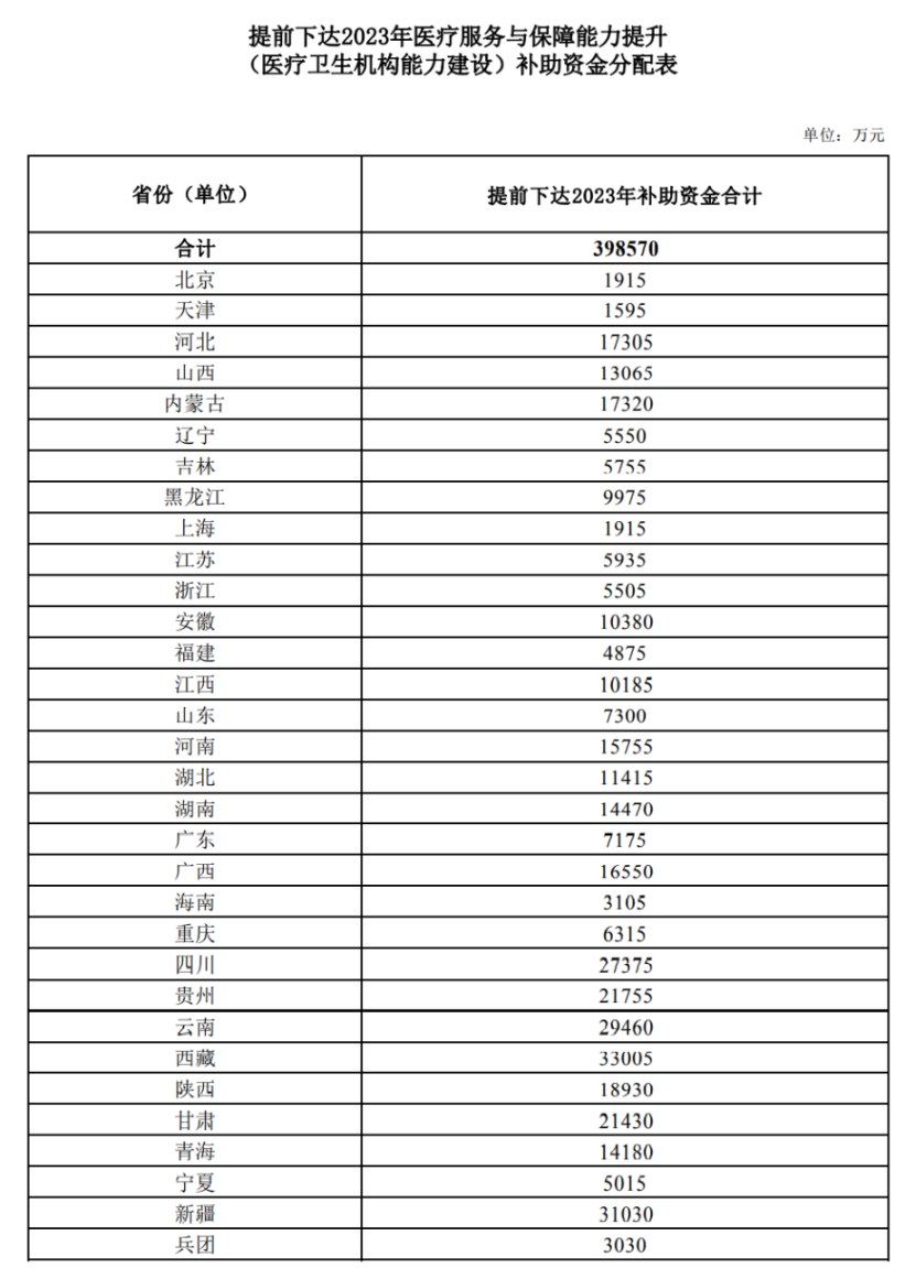 提前下达2023年医疗服务与保障能力提升(医疗卫生机构能力建设)补助资金39.85亿余元,用于提升医疗卫生机构能力建设和服务水平。对比去年提前下达的48.42亿元有所下降。