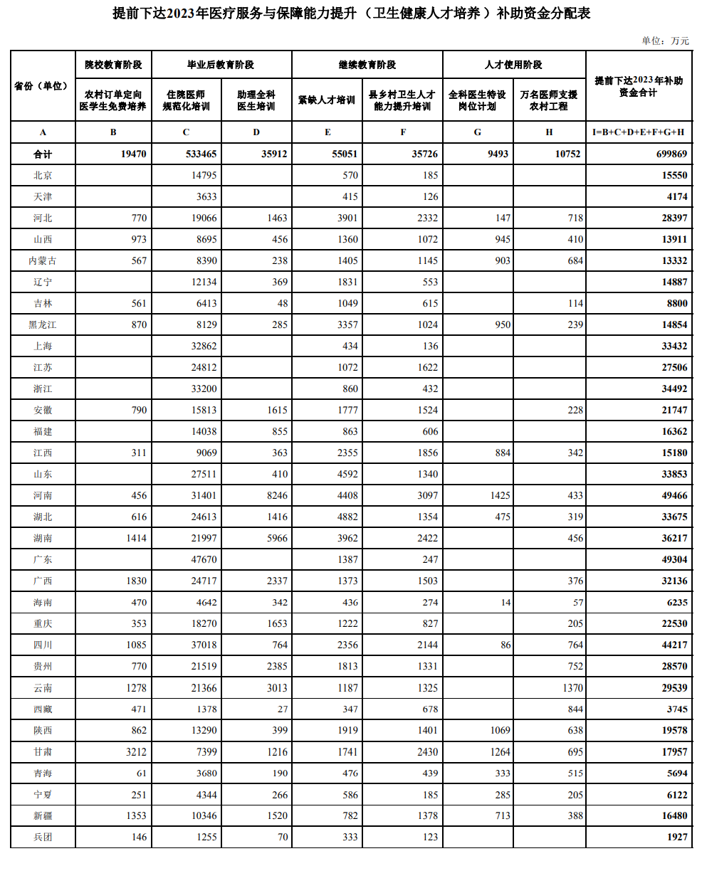 提前下达2023年医疗服务与保障能力提升(卫生健康人才培养)补助资金69.98亿余元,用于支持开展卫生健康人才培养工作。对比去年提前下达的76.26亿元也有所下降。