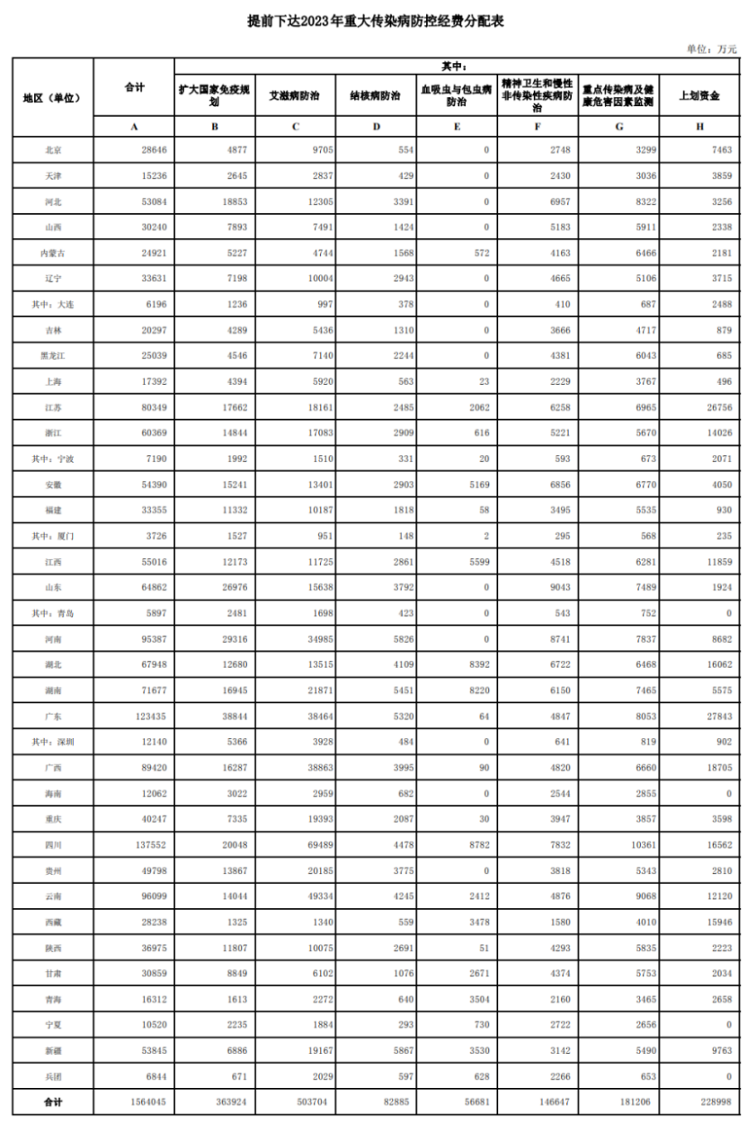 具体来看,提前下达2023年重大传染病防控经费156.4亿余元,主要用于扩大国家免疫规划、艾滋病防治、结核病防治、血吸虫与包虫病防治、精神卫生与慢性非传染性疾病防治、重点传染病及健康危害因素监测等工作。